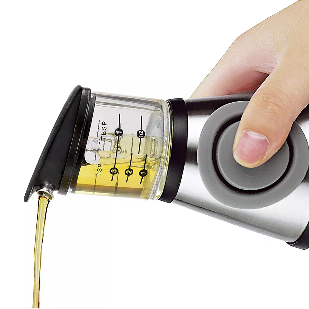 - Convenient miniature measuring cup draws oil from carafe for easy pouring.