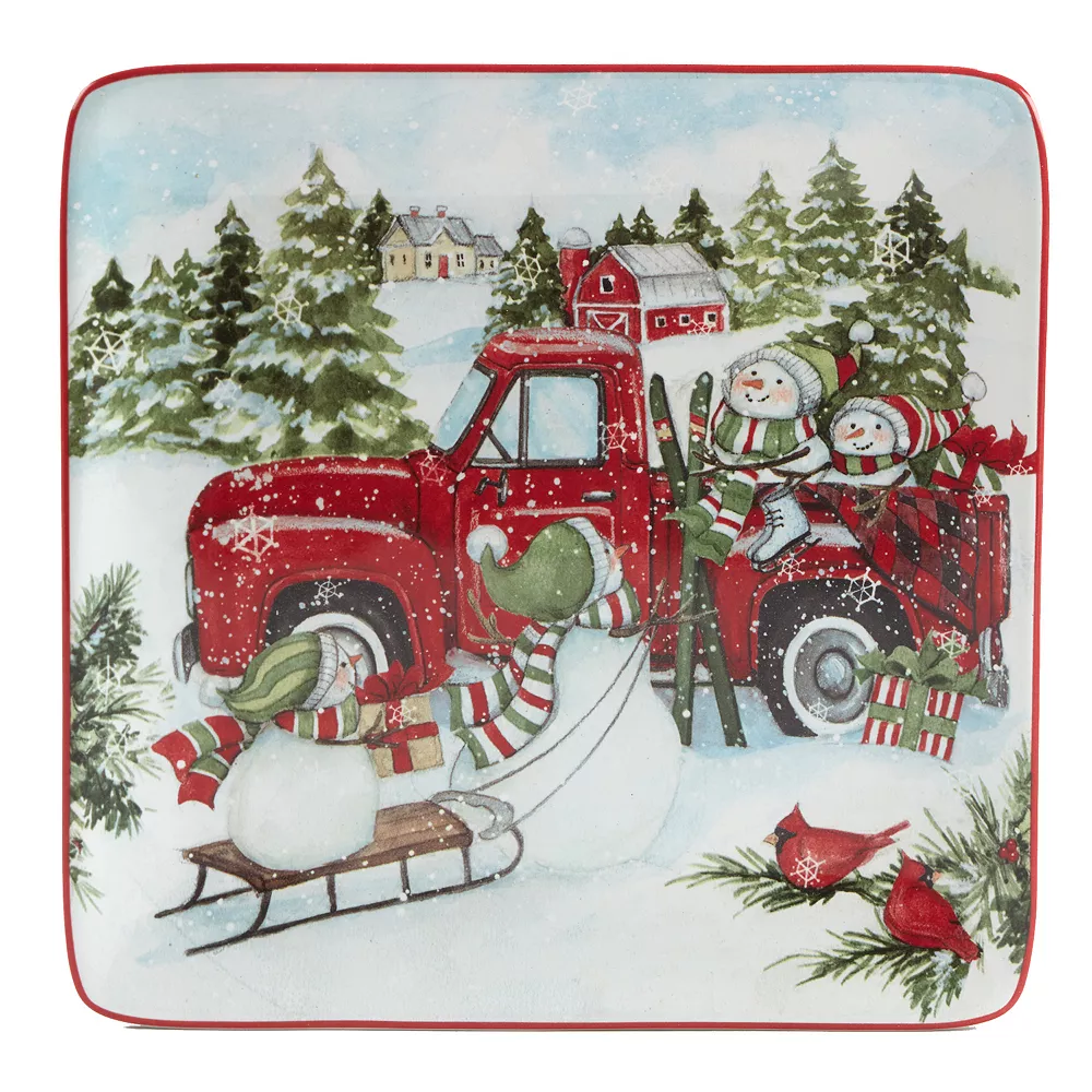 Give your holiday dining decor a festive update with this Certified International Red Truck Snowman four-piece dessert plate set.