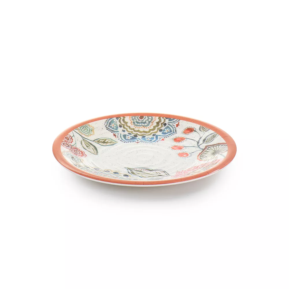 Beautify the dinning table for your big night with the Ester 12 Piece Melamine Dinnerware Set by Elama. With a combination of warming colors, the set features a beautiful mandala design. The ribbed textured on each plate helps keep food and sauces in place. Its melamine construction is shatter resistant. For proper and long lasting care do not microwave and wash in the top rack of dishwashers. Great for outdoor festivities from barbecues and picnics to pool parties and kid’s birthdays.