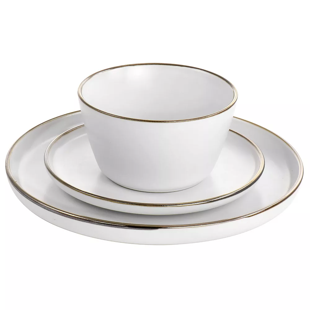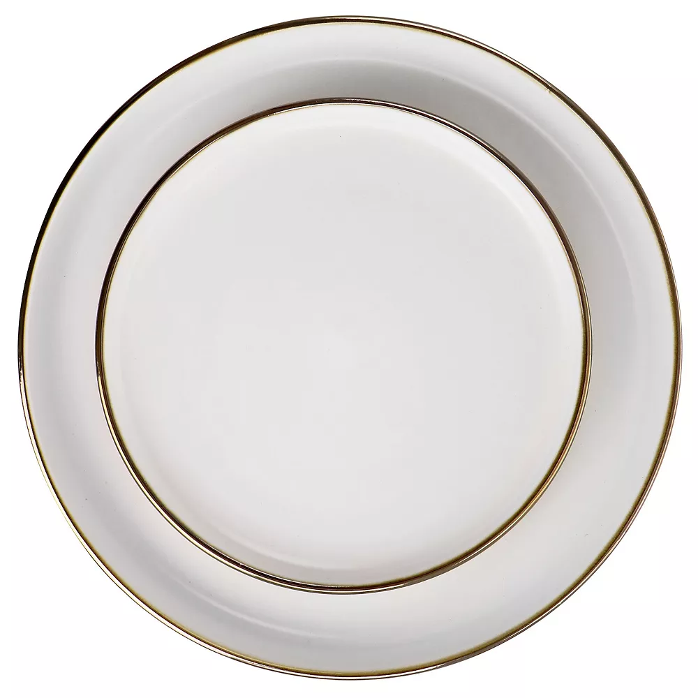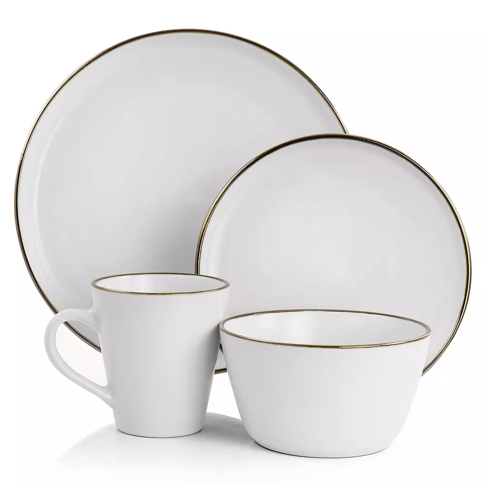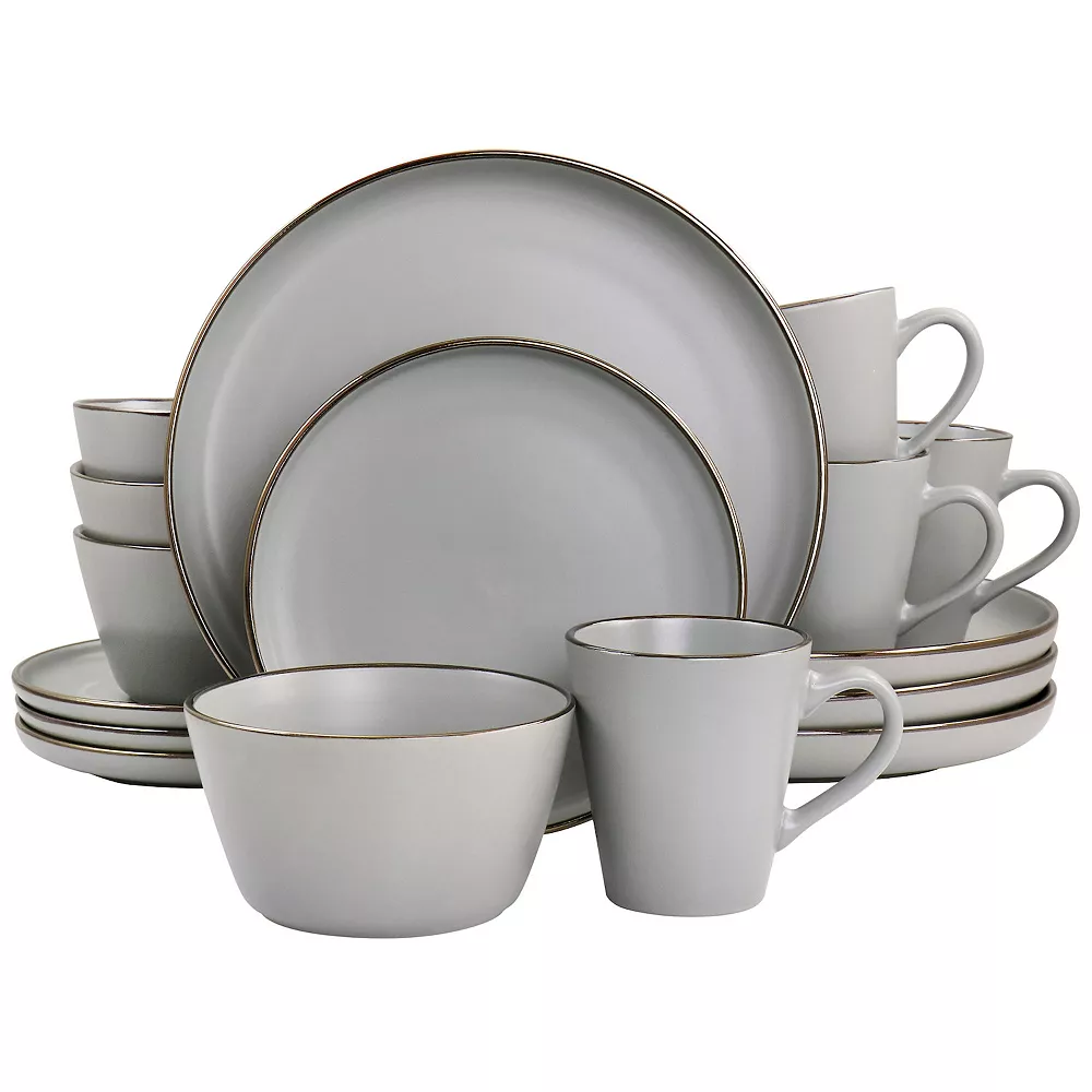 Add a beautiful accent to your dining table with the Elama Louis 16 Piece Round Stoneware Dinnerware Set in sophisticated Slate Matte Colors with Gold Rim Trim. Each dish is creatively crafted with a unique flat base, raised rim and trimmed in gold. Beautifully finished off with a thin, elegant gold rim this set is a statement piece. Constructed of Stoneware, this set is ideal for special occasion gatherings and sturdy for every day use. Each plate is microwave safe for quick reheating and dishwasher safe for easy cleaning.