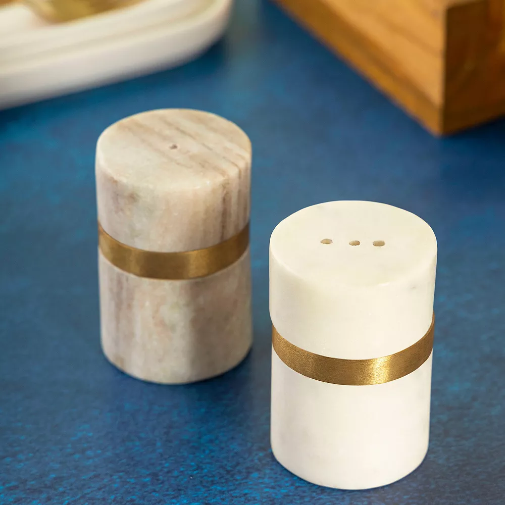 Add classic sophistication to seasonal gatherings with GAURI KOHLI white & beige marble salt & pepper shakers that celebrate the dramatic beauty of stonemasonry. Each shaker is distinguished by rich hues and intricate markings as unique as the stone from which it was cut.