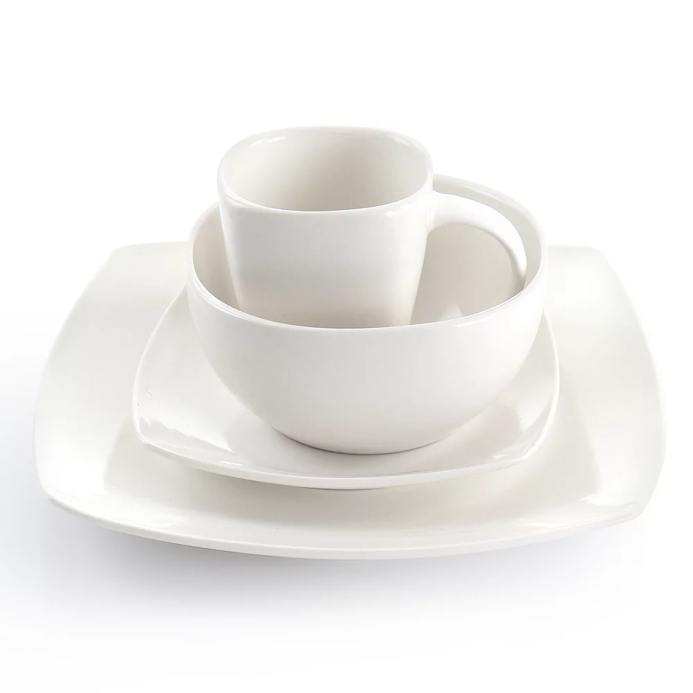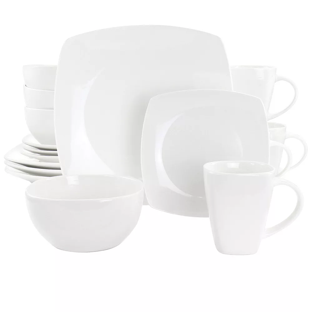 The Gibson Elite Soho Lounge 16 Piece Square Ceramic Dinnerware Set in White is a clean and natural look that brightens up any dinner table. It features a bright and glossy white finish. The square shape of each piece frames photogenic meals for perfect presentation. Made of fine ceramic, this table setting is dishwasher safe for fast cleaning and microwave safe for easy heating. Serve guest a fantastic dinner, enjoy an easy going lunch with family, or delight yourself to the perfect breakfast.