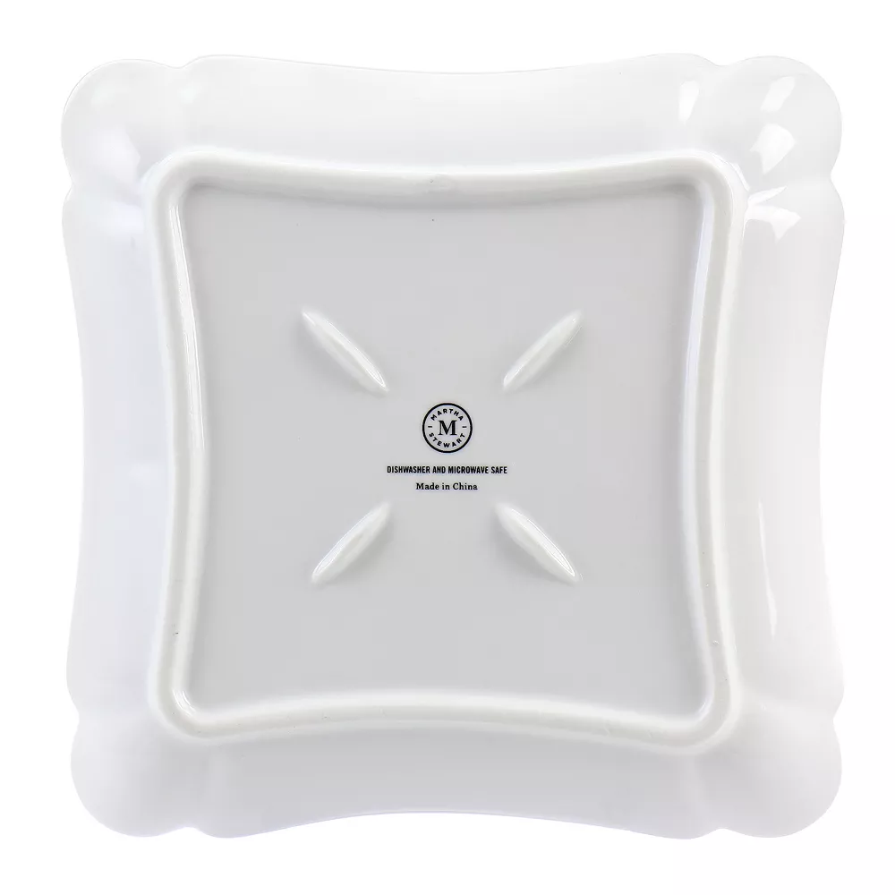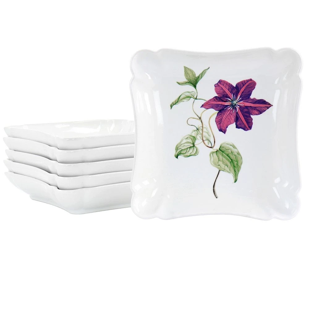 The Gibson Home Botanical Garden 6 Piece 8.75 Inch Fine Ceramic Dish Set in White brightens up any living space. This table setting features a stunning illustration of a purple flower and vines at the center. The unique scalloped corners of the square dishes draws focus to treats or items held within each piece. Its fine ceramic construction is dishwasher safe and microwave safe for convenient daily use. Decorate the table with snacks, sweet treats, gifts or have the set hold onto regular household items. Item Dimensions: 8.75 x 8.75 x 1.50 Item Weight: 3.00lbs
