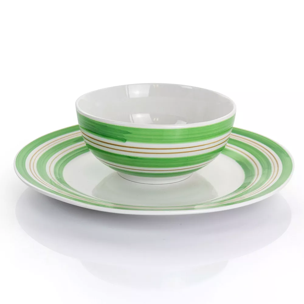 Splash color into the home kitchen with the Gibson Home Sunset Stripes 12 Piece Round Fine Ceramic Dinnerware Set in Green. The bright green stripes can match up with any welcoming dinner table. The simple dish shape along with the stylish striped pattern gives food the center of attention while maintaining visual appeal. The fine ceramic set is dishwasher safe for easy cleaning and microwave safe for quick reheating. Serve guests for breakfast, lunch, or dinner with this colorful dinnerware set.