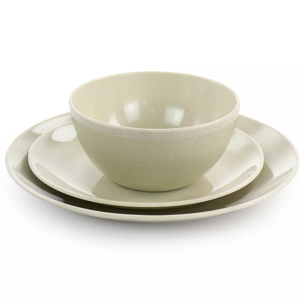 The Martha Stewart 12 Piece Melamine Dinnerware Set in Taupe matches with any stylish table setting. This dinner plate set features a speckled taupe color that perfect frames luxurious meals. The break resistant melamine makes the set ideal for outdoor eating or for use around kids. For long lasting care, the set is not microwave safe and is only top rack dishwasher safe. Enjoy eating at anytime in the be it breakfast, lunch or dinner.