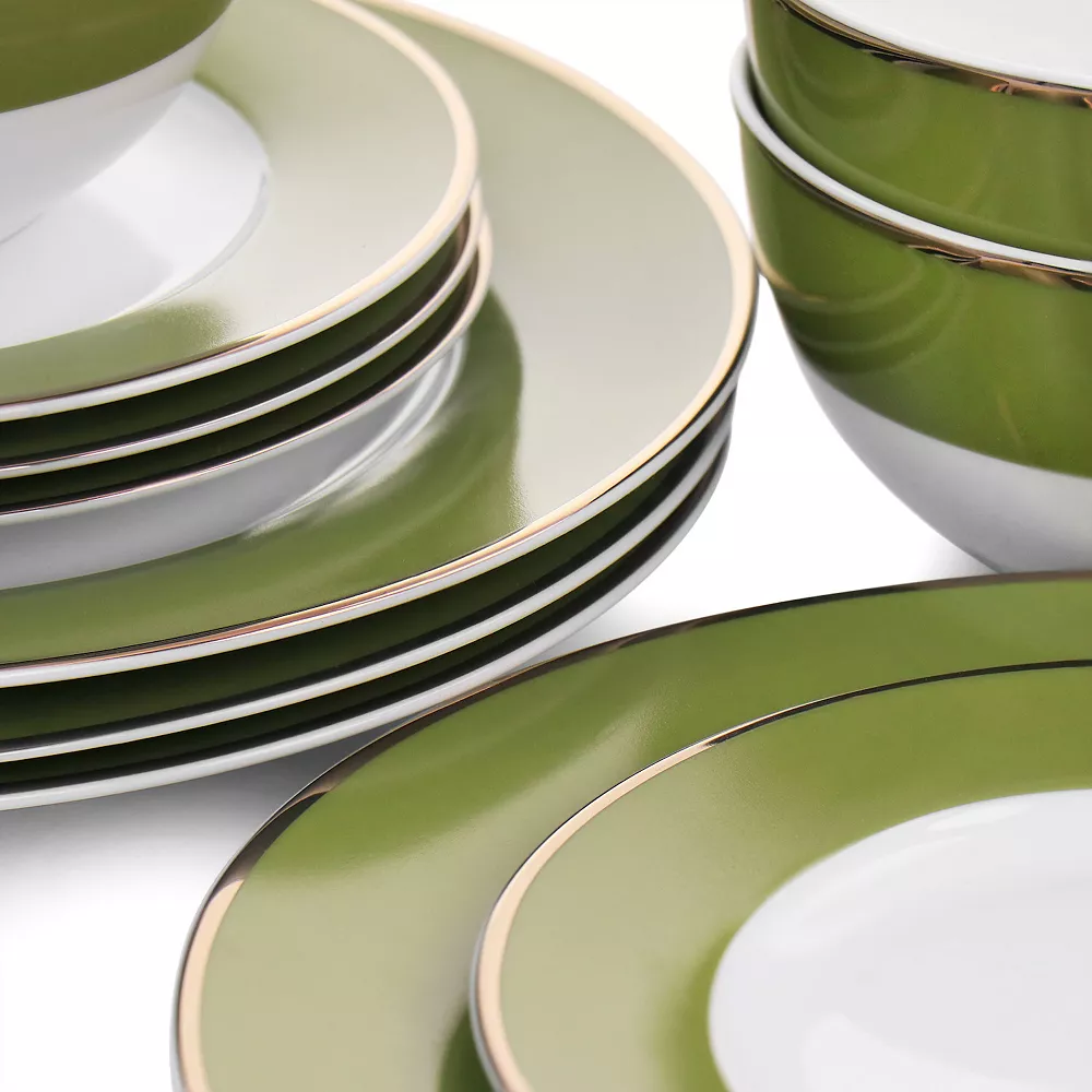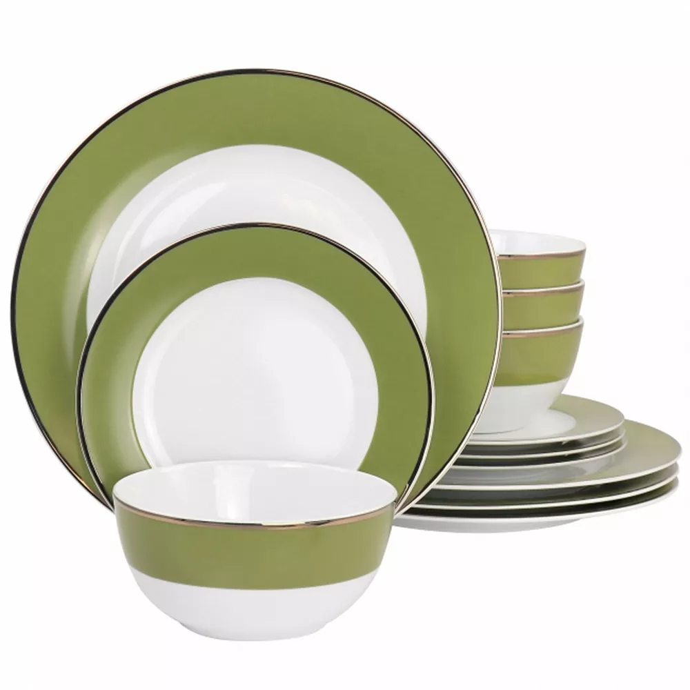 Make your dining experience special with this gold rimmed 12 piece dinnerware by Gibson Everyday! Formal or relaxed, your table setting sets the tone for your entire occasion. Use this gold rimmed set to display your unique style and showcase your favorite dishes. Designed with a colored edge and gold plated rim, this set adds some color and class to any meal. It comes with service for four people, including dinner plates, salad plates, and cereal bowls. Fine ceramic construction is lightweight and durable, hand wash only.