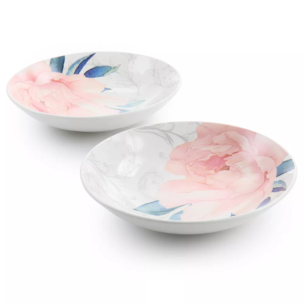 the Gibson Everyday Peony 2 Piece 9 Inch Fine Ceramic Dinner Bowl Set in Pink brings spring time charm that brightens any room. These ceramic dishes feature a watercolor like floral design through out the interior. The durable body is dishwasher safe and microwave safe for improved quality of life. Serve cozy soups and stews, or enjoy delightful custards and ice cream.