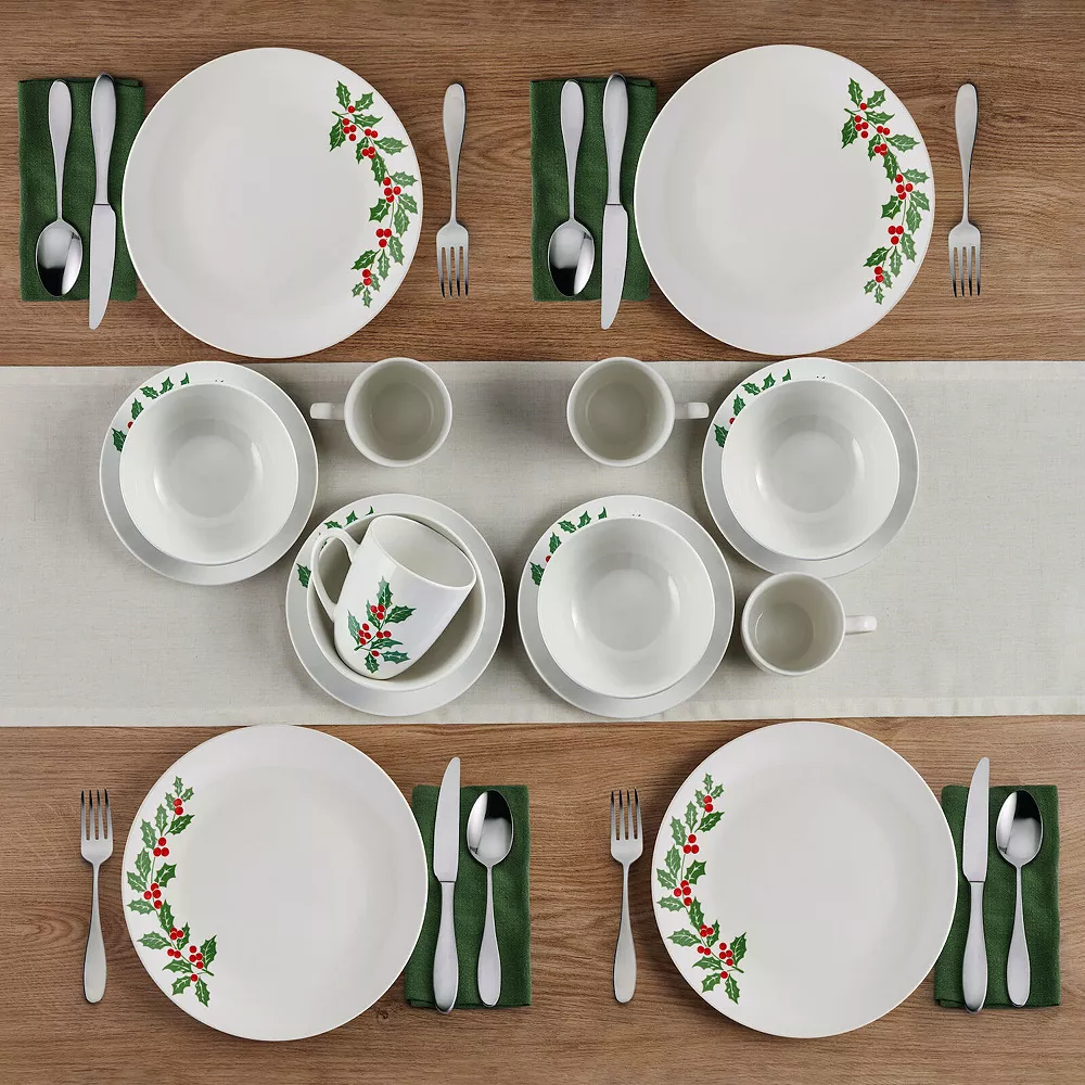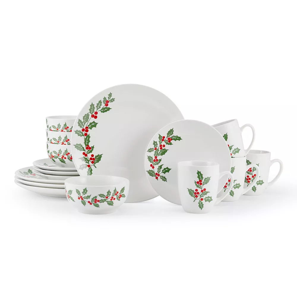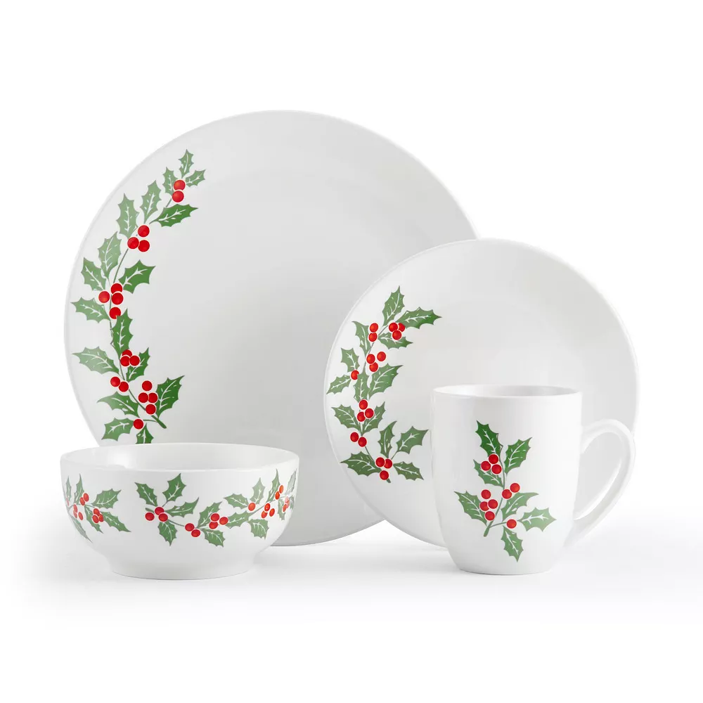 Festive holly and berries decorate this Studio Nova dinnerware set, making it perfect for every holiday meal or gathering.